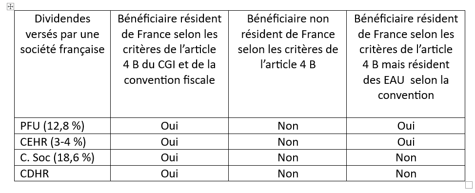 Si le bénéficiaire est non-résident au sens de l’article 4 B du CGI, il bénéficiera pleinement des stipulations de l’article 8 de la convention, qui attribuent aux Émirats le droit exclusif (ce qui constitue une autre spécificité de la convention) d’imposer les dividendes. Il ne sera donc redevable d’aucune imposition en France.